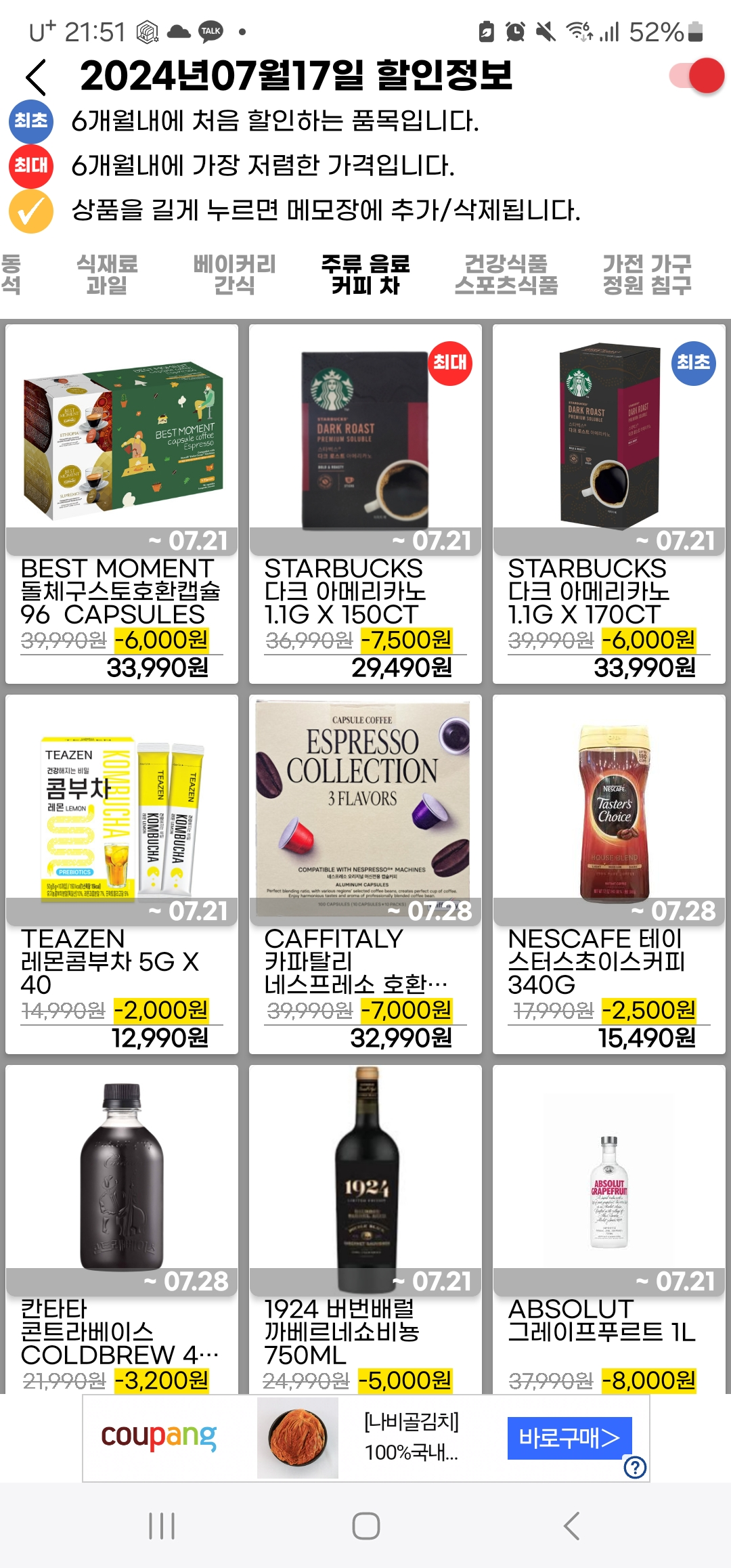 새롭게 추가되거나 할인이 임박한 제품의 경우에는 알람이 뜨기도 합니다.