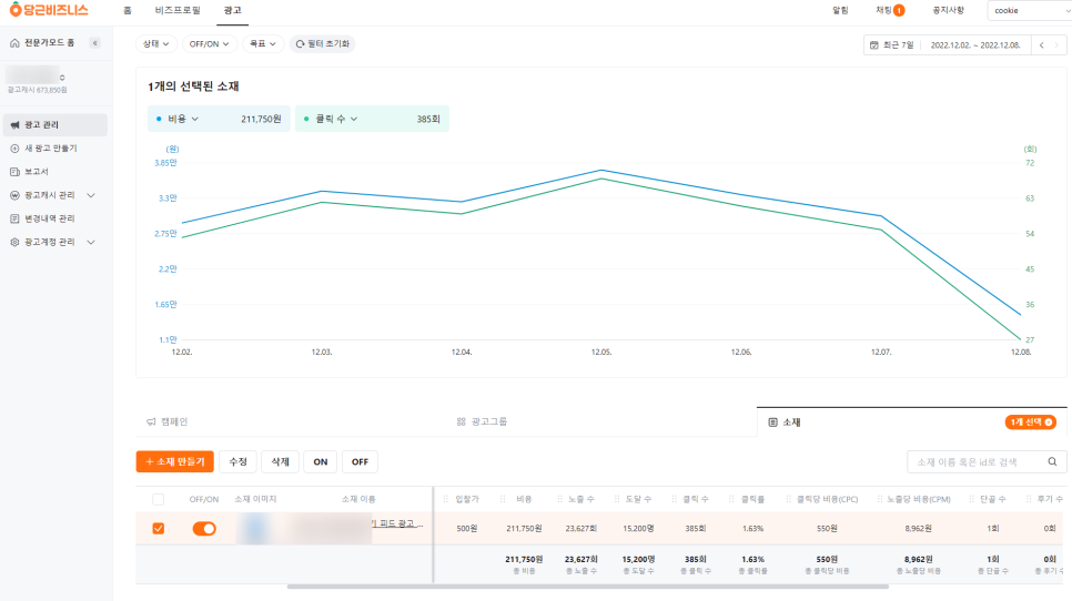 모든게 완료되고 최종적으로 광고를 집행하기 시작하면 이런 화면에서 소재를 볼 수 있습니다.
