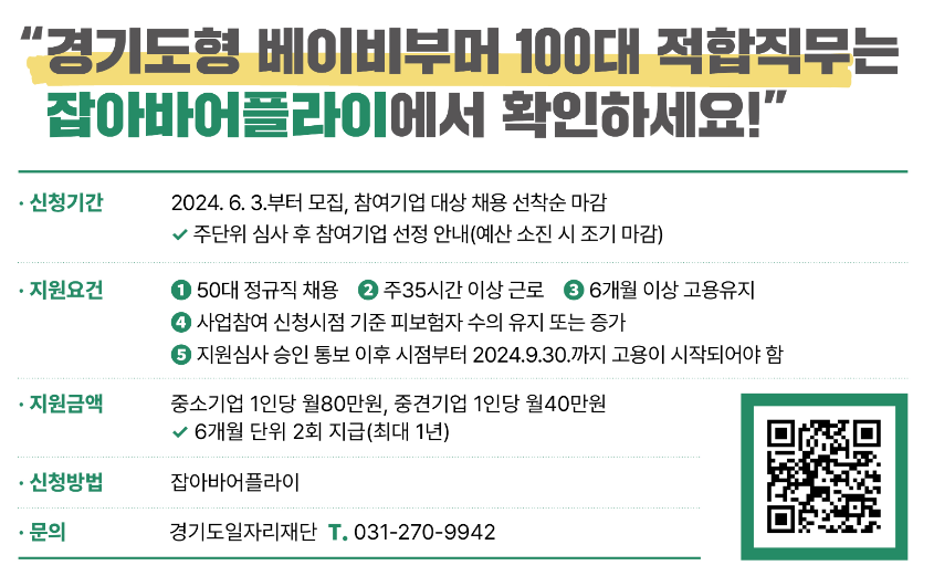 경기도 일자리 재단에서 주최하는 지원금 사업으로, 중장년층을 직원으로 채용하면 근로자 1인당 월 40~80만원, 최대 12개월의 인건비를 정부에서 지원해줍니다.