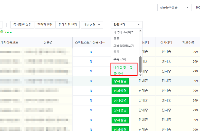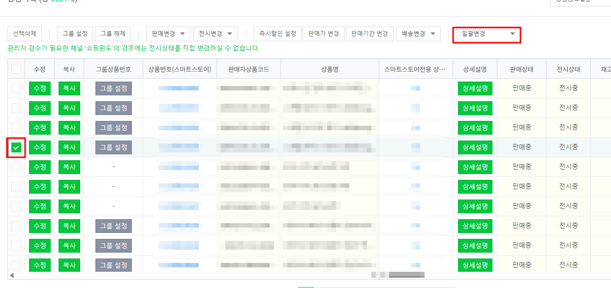4. 홍보하길 원하는 상품을 체크하신 뒤에 우측에 보이는 일괄변경 버튼 클릭