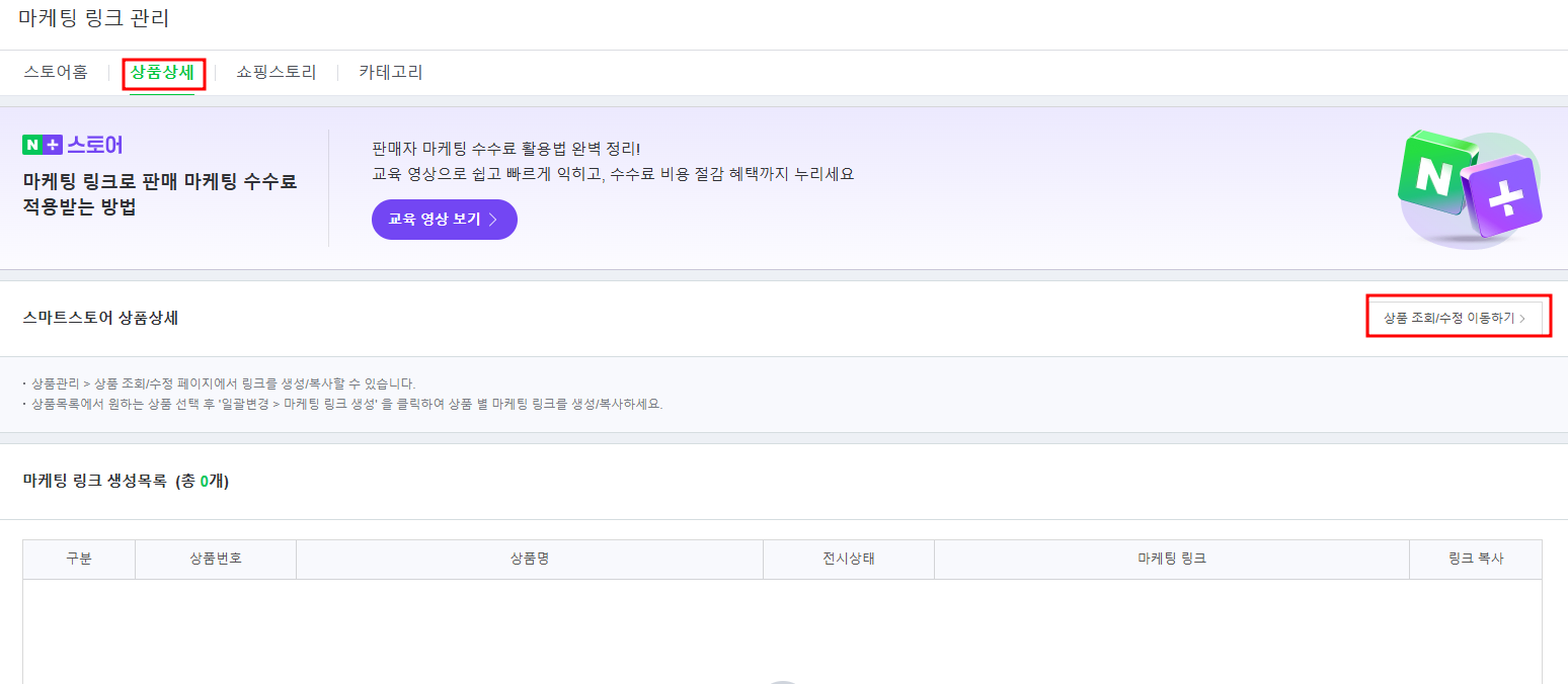 3. A라는 상품을 하나씩 개별로 홍보하여 외부유입을 할 경우에는 상품 상세를 누르신 뒤 우측에 있는 상품조회/수정 이동하기 클릭