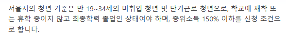 현재 청년의 기준은 만 19~34세로 고지되어 있으며, 여기에 병역 기간은 제외됩니다.(ex: 현재 35세인데 군복무 기간이 2년이라면 33세로 계산)