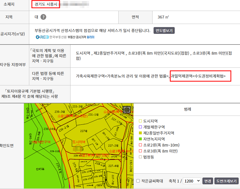 국토부 사이트인 토지이음에서 검색한 경기도 지역의 과밀 비과밀 확인 방법 (용인-비과밀, 시흥-과밀)