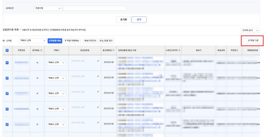 1. 우선 쿠팡 마켓플레이스에서 처리해야 될 주문 건들을 일괄 선택하고 우측에 엑셀 다운을 누릅니다.
