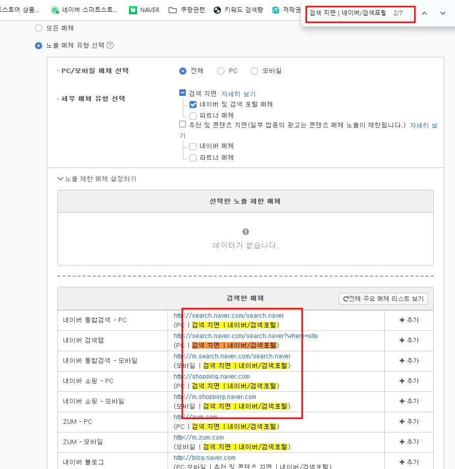 여기에서 위 8가지를 제외한 다른 광고들은 전부 노출 제한 매체로 우측 버튼 "+추가"를 눌러서 넣어주시면 됩니다.