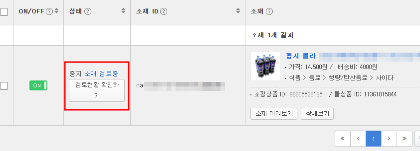 바로 광고가 되는것이 아니라 네이버에서 광고를 해도 되는 상품인지 아니면 부적절한 상품인지(과대광고 등)를 체크하는데요. 보통 1~3일정도 소요가 됩니다. 그 전까지는 소재 검토중이라고 아래처럼 뜨게 됩니다.