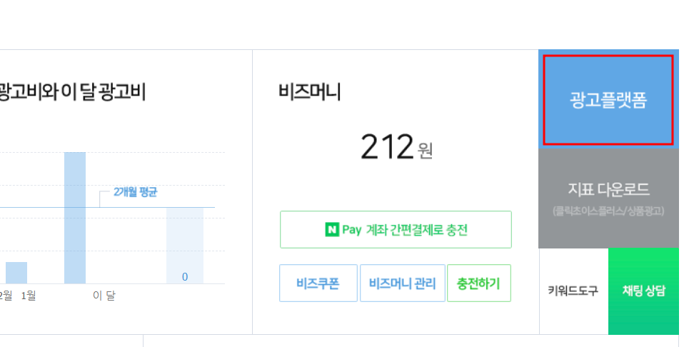 그 전에 우선 광고 승인이 되면 바로 광고가 돌아갈 수 있도록 하기 위해서는 비즈머니 충전(광고비 충전)을 해주셔야 합니다. 상단에 충전하기 버튼을 통해서 진행하실 수 있습니다.