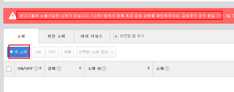 그럼 빨간색으로 이렇게 뜨는데요. 쫄지 마시고요. 아직 등록한 광고 상품이 없어서 그런거니깐요. 왼쪽에 새 소재를 눌러줍니다.