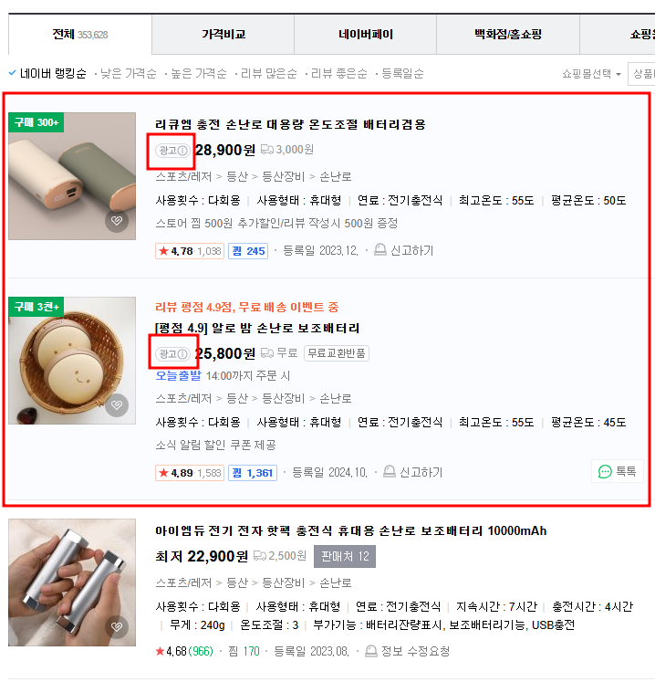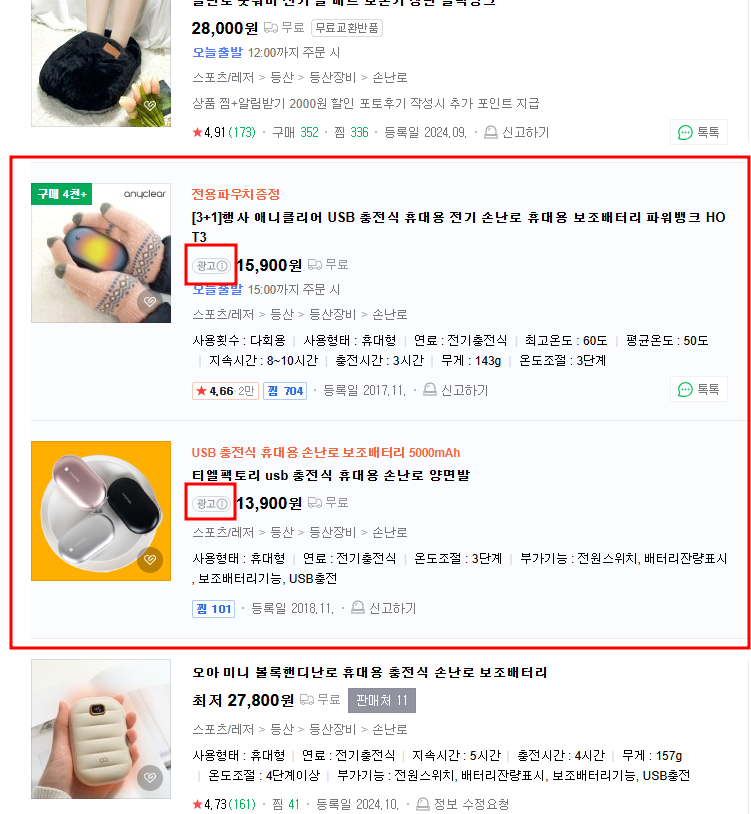 제가 위 사진처럼 검색을 "손난로" 로 했을 때 제일 먼저 나오는 2개의 상품이 광고입니다.