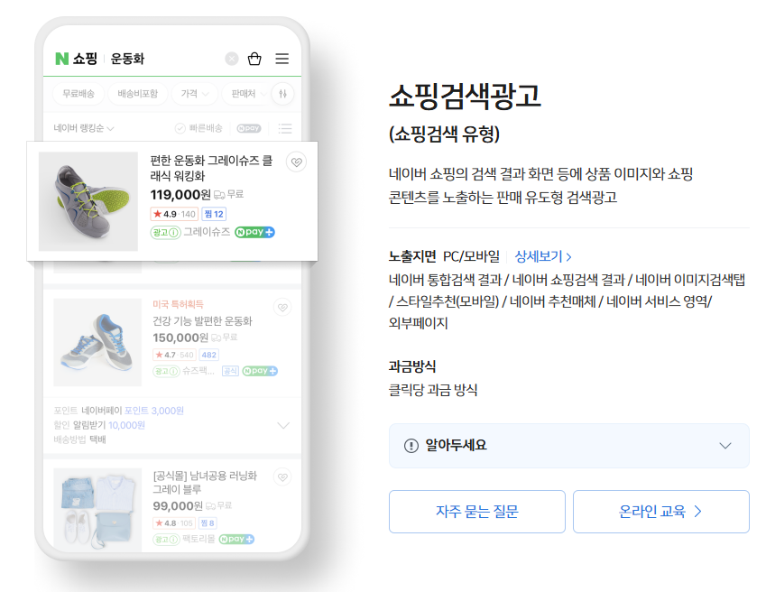 제가 가장 많이 집행하는 광고입니다. 아무래도 스마트스토어나 이커머스쪽 쇼핑몰 운영을 하시는 분들이라면 가장 기본이 되는 광고라고 할 수 있겠습니다. 저도 이커머스쪽으로의 다양한 정보를 소개하는 역할이다보니, 앞으로 알려드릴 내용도 이 "쇼핑검색광고" 에 대한 내용을 가장 많이 소개할 예정입니다. 주의깊게 봐주세요!!