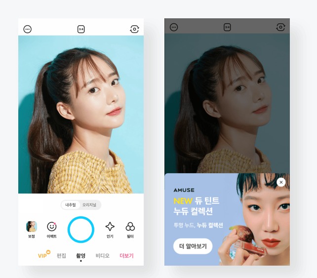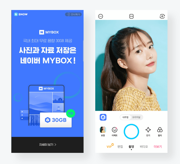 우리가 잘 아는 스노우 카메라앱입니다. 네이버와 연계가 되어 있어서 해당 위치에 광고를 송출할 수 있습니다.