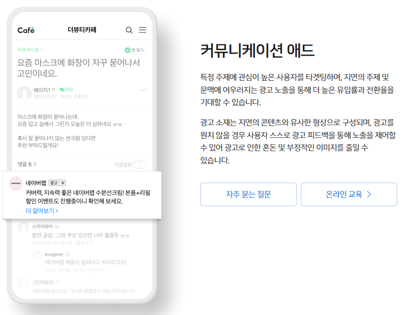 쉽게 연관성이 높은 페이지에 광고 메세지를 노출시켜 광고인듯 아닌듯 하는 느낌을 주며 맥락이 유사하기 때문에 클릭을 유도할 수 있는 간단한 광고 형태입니다. 가장 많이 노출되는 곳이 네이버 카페와 같은 커뮤니티 공간입니다.