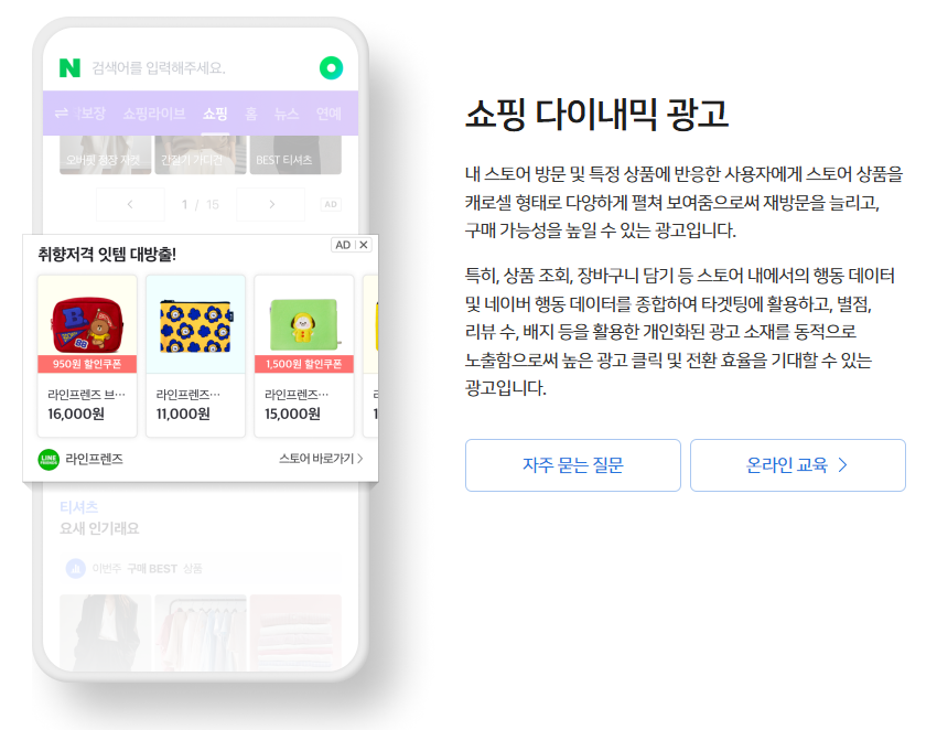 보통 스마트스토어 하단에서 노출되는 구좌가 있습니다. 클릭한 상품과 유사한 다른 상품들을 추천해주시면 캐로셀(컨베이버 벨트처럼)의 형태로 넘기면서 연관된 상품을 보여주는 광고입니다. 장바구니를에 담아놓았다거나 클릭해서 채류했던 상품들과 유사한 것들이 보여지는 AI기반 광고입니다.