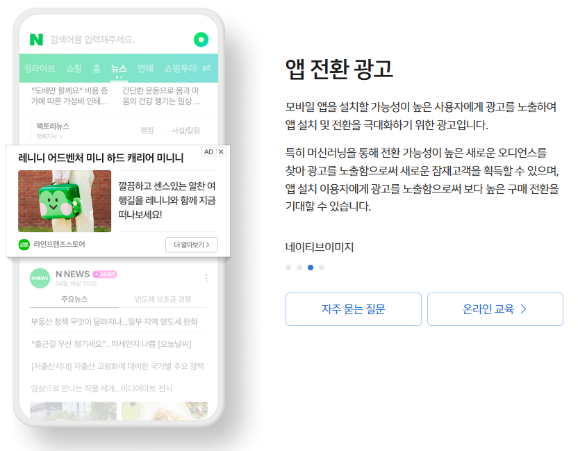네이버 앱을 설치할 가능성이 높은 사용자에게 광고를 노출하여 앱을 설치하게 하면서 동시에 광고를 하는 상품입니다.