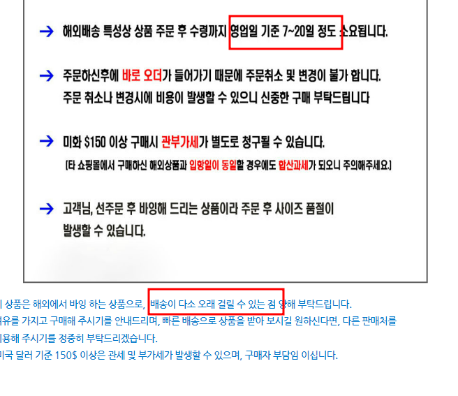 국내배송으로 잘못 제품을 올리게 되면 이 또한 CS폭탄을 맞으실 수가 있고, 고객의 통관번호입력도 안되어있는 주문이 들어오게 되기 때문입니다.