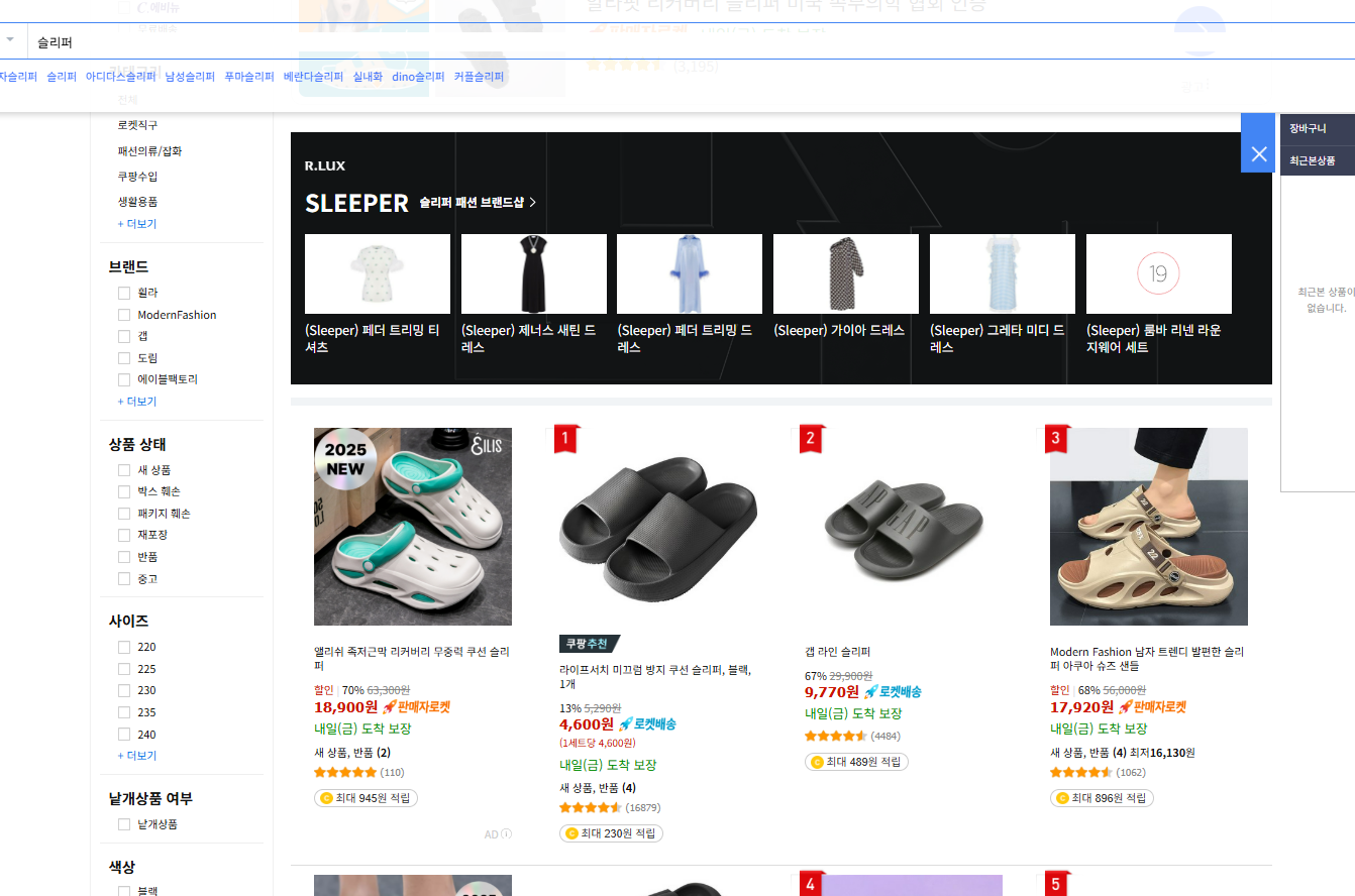 1. 우선 쿠팡에서 내가 판매하고 싶은 상품을 검색합니다. 저는 여름인만큼 날씨가 더우니 사용할 수 있는 제품인 "슬리퍼"를 한번 검색해보도록 하겠습니다.