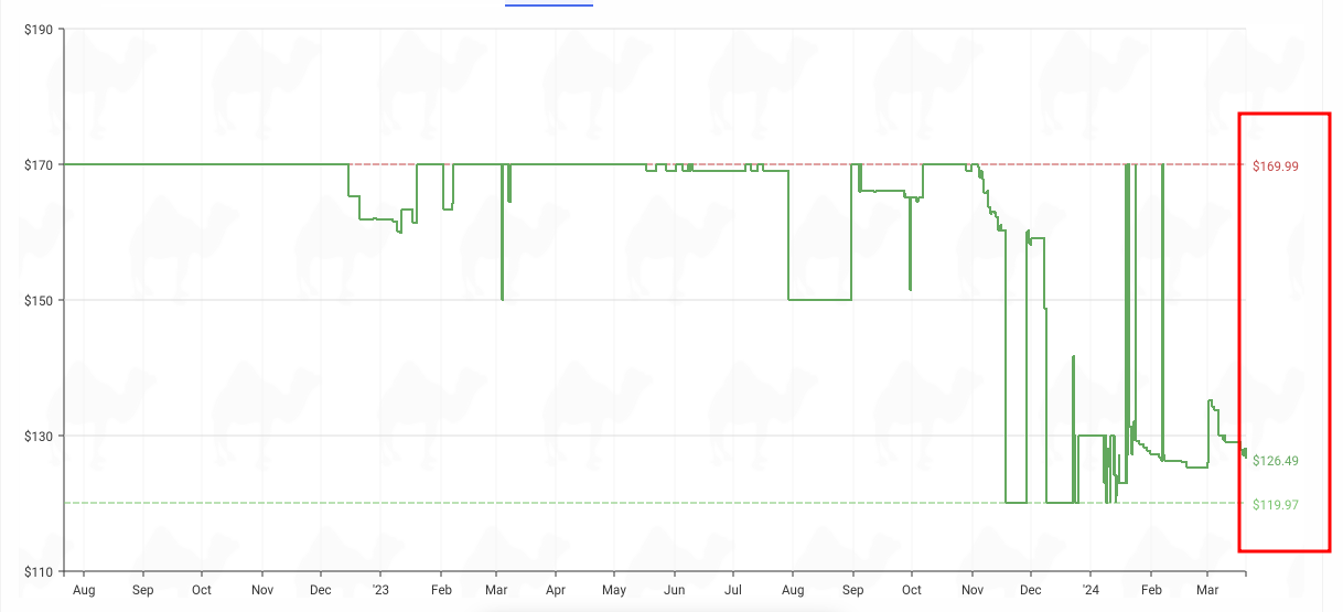 자 보시면 이 마샬 스피커는 현재 $126.49에 판매가 되고 있는데요. 판매 데이터를 보시면 현재 126.49보다 저렴한 $119.97이 최저가였음을 볼 수 있습니다. 그리고 그 기간은 작년 11월~12월로 블프때 가격인 것 같네요.