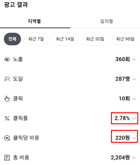 광고 비용을 결제하고 집행을 시작하면 이렇게 클릭비용과 효율을 보실 수 있습니다.