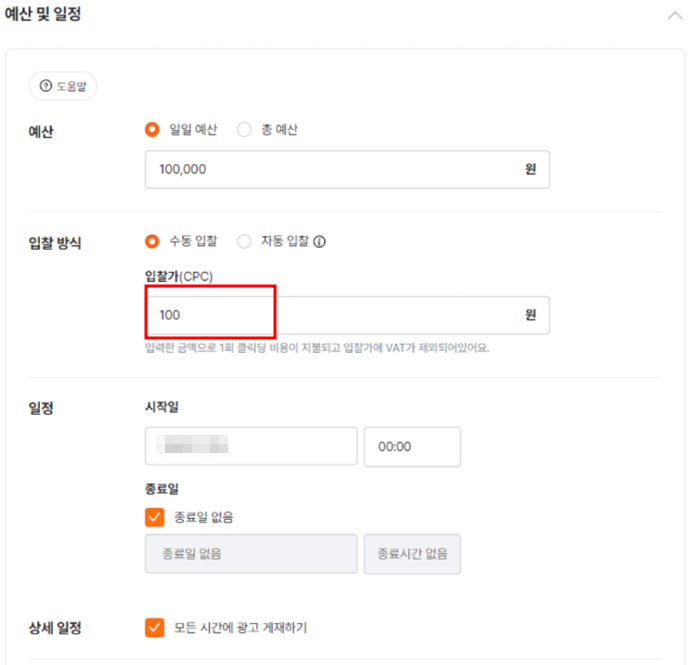 전문가모드의 예산에서 입찰가는 첫 시작을 무조건 100원으로 시작하시기 바랍니다.