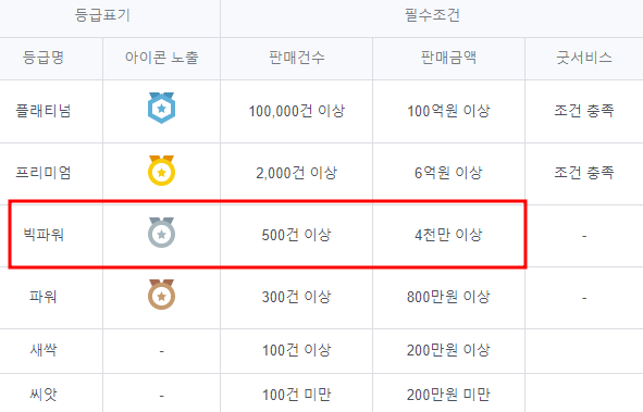 네이버 스마트스토어 빅파워 기준은 주문건수 500건 이상과 3달간 매출 4000 이상이 되어야 합니다.