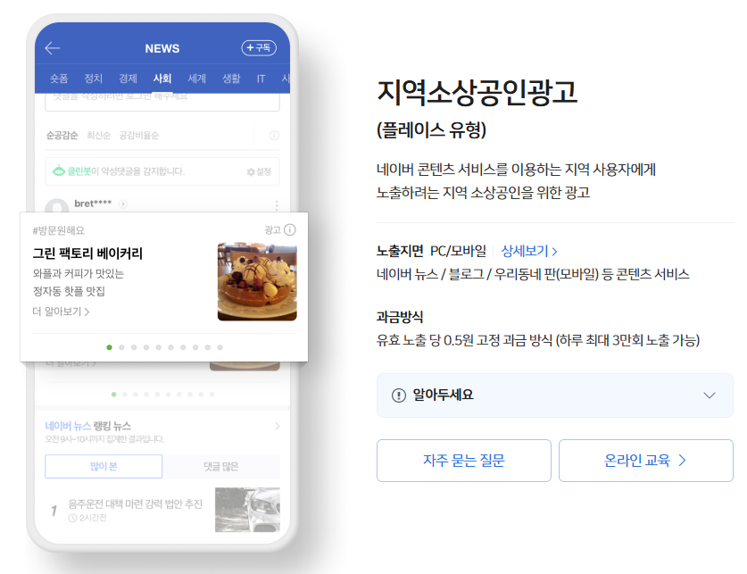 이 광고는 일단 비쌉니다. 일반 소상공인들이 들어가기 쉽지 않은 광고인데요. 보장형 광고는 말 그대로 광고를 보장해준다는 개념이며, 시간당 비용을 부과하는 개념입니다.(CPT)
