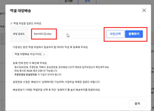 8. 저장하신 뒤 쿠팡 마켓플레이스로 가서 다시 엑셀 대량 등록을 누르신 뒤, 만들어놓은 파일을 넣어주시고 등록하기 버튼을 누릅니다.