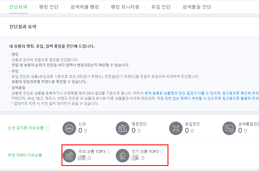 진단 요약에 들어가면 위 이미지처럼 주의 상품(순위가 떨어지고 있는)과 인기 상품(순위가 올라가고 있는)을 알려줍니다.