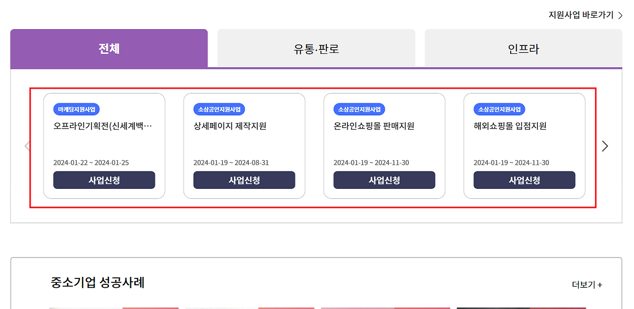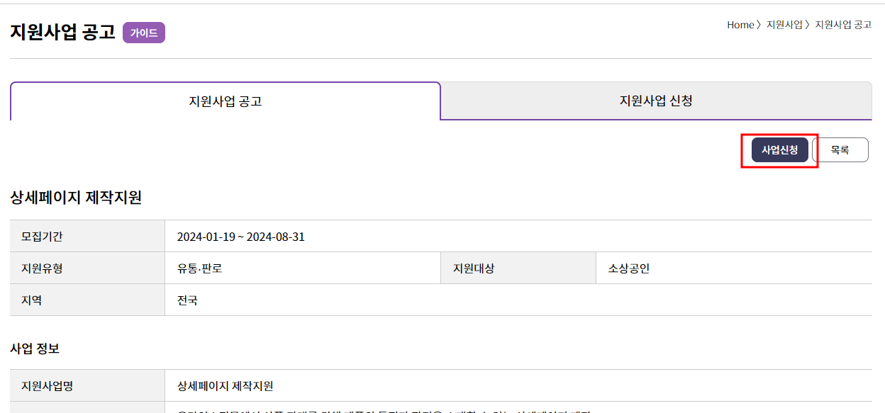 또한 우측에 보시면 사업신청이라는 버튼이 있습니다.